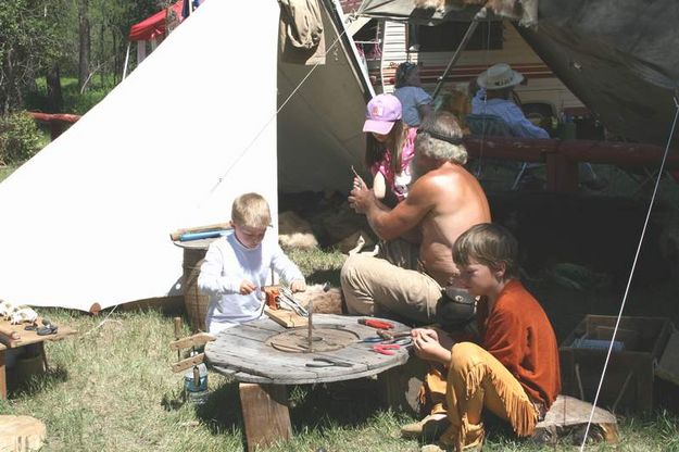 | LibbyMt.com > News > July 2008 > Two Rivers Rendezvous 2008 > Weezil makes copper bracelets |