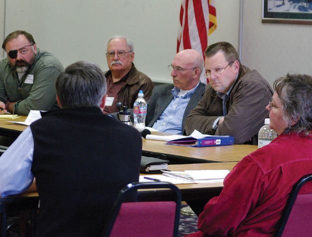 U.S. Sen. Jon Tester listens to local concerns during a panel discussion Saturday at Libby City Hall. Seated to Tester’s right are (from left) Lincoln County Commissioner Tony Berget, Paul Rumelhart and Noel Williams. In foreground are Kootenai National Forest Supervisor Paul Bradford and Robyn King of the Yaak Valley Forest Council. Photo by Kootenai Valley Record. |
