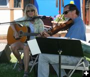 Ann Mason and Lee Tonner entertain at Wednesday's Lemonade on the Lawn at the Libby Library. This is the sixteenth season of Lemonade on the Lawn during June and July at the library. Free lemonade is provided and lunch is available for purchase, provided by