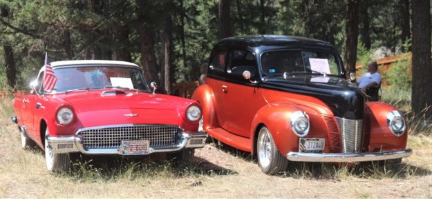 | LibbyMt.com > News > July 2024 > Happy's Inn Car Show > 1957 Ford Thunderbird, 1940 Ford sedan |